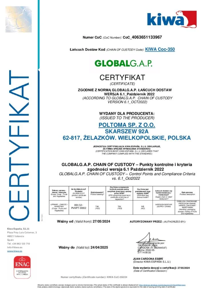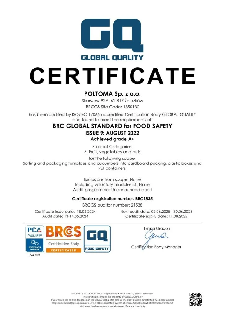 GLOBALG.A.P., GLOBALG.A.P. GRASP, HACCP,  BRC GS, GLOBALG.A.P. CoC